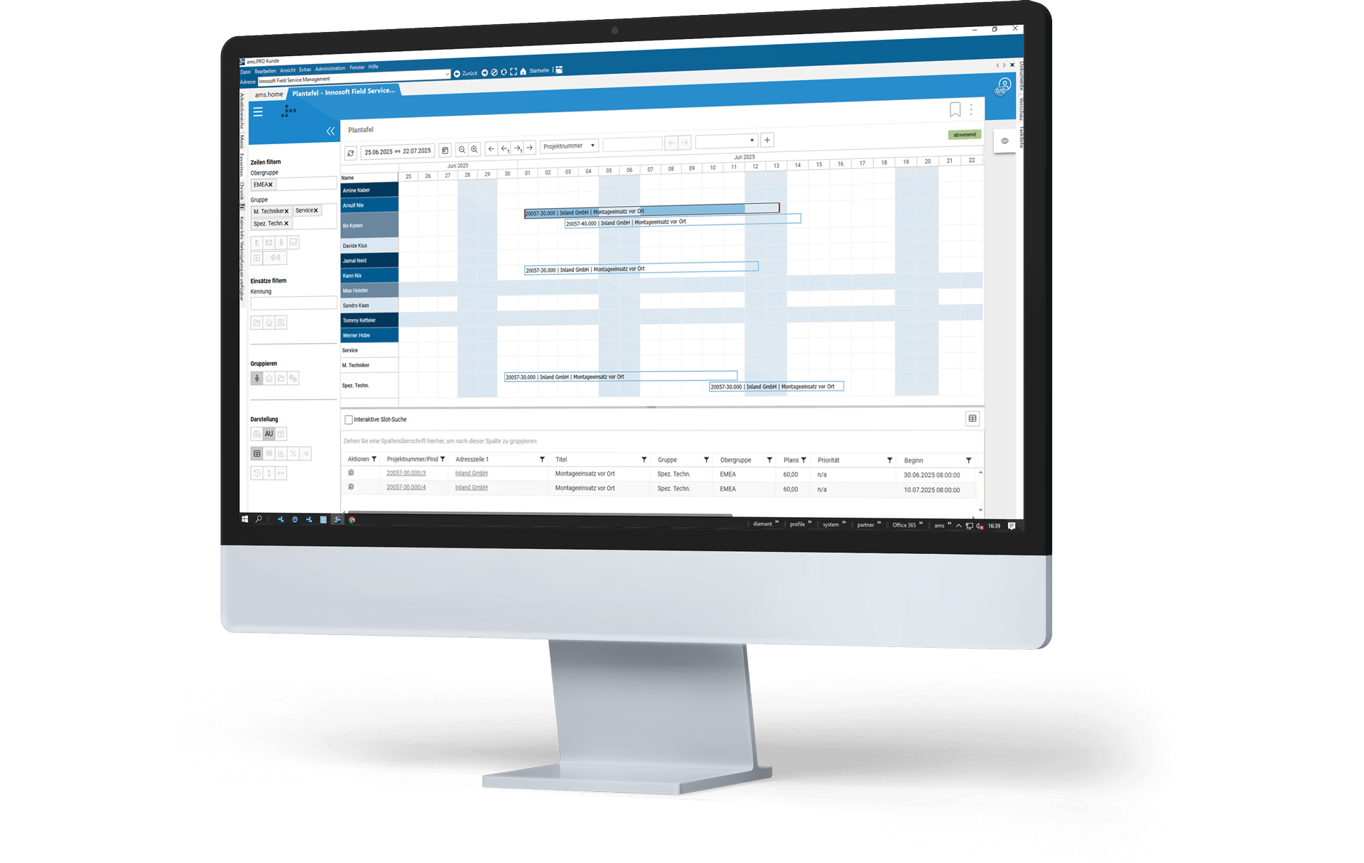 Mit unserem vollständig in ams.erp integrierten Field-Service-Management ams.workforcePlanning können Sie Ihre Mitarbeiter und Ressourcen effektiv planen und optimal einsetzen. Lassen Sie sich nicht nur die Fähigkeiten Ihrer Mitarbeiter für Ihre Planung darstellen, sondern Sie haben in Kombination mit dem Zeiterfassungsmodul ams.time auch alle Fehlzeiten stets im Blick. Das Herzstück der Personaleinsatzplanung ist eine digitale Plantafel, die Ihre Serviceplanung und Mitarbeitereinsätze übersichtlich und transparent darstellt und verwaltet. So planen Sie Ihre Außendienst-, Service- und Montageeinsätze effizienter, stimmen diese optimal aufeinander ab, sparen Zeit und Kosten und sorgen dauerhaft für zufriedene Kunden.